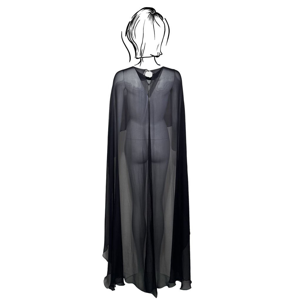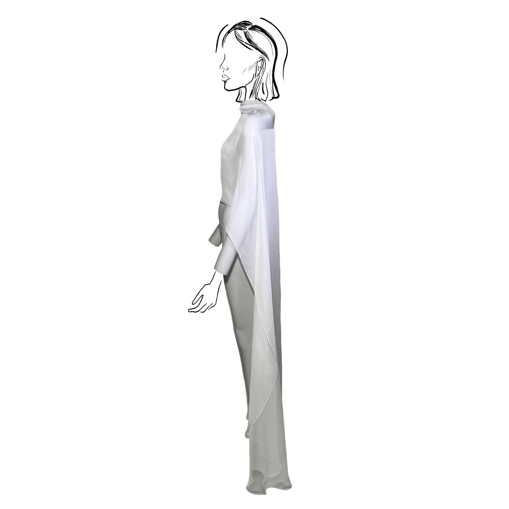 A lightweight chiffon veil is an elegant and airy accessory that can instantly transform even the simplest outfit. Its even, elongated line falling just above the ground creates a beautifully fluid effect in motion and offers wide layering possibilities—it softens structured outfits or naturally unifies different materials.