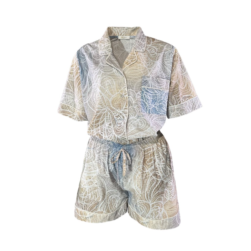 The new JK Klett pajama gift set with a practical pouch is a perfect combination of comfort, subtle elegance, and harmonious design. Premium cotton materials stand out for their softness and natural breathability, ensuring comfort throughout the night. The iconic JK Klett print gives the entire set a distinctive style, while the relaxed cut of the shirt and pocketed shorts gracefully highlights refined home elegance.