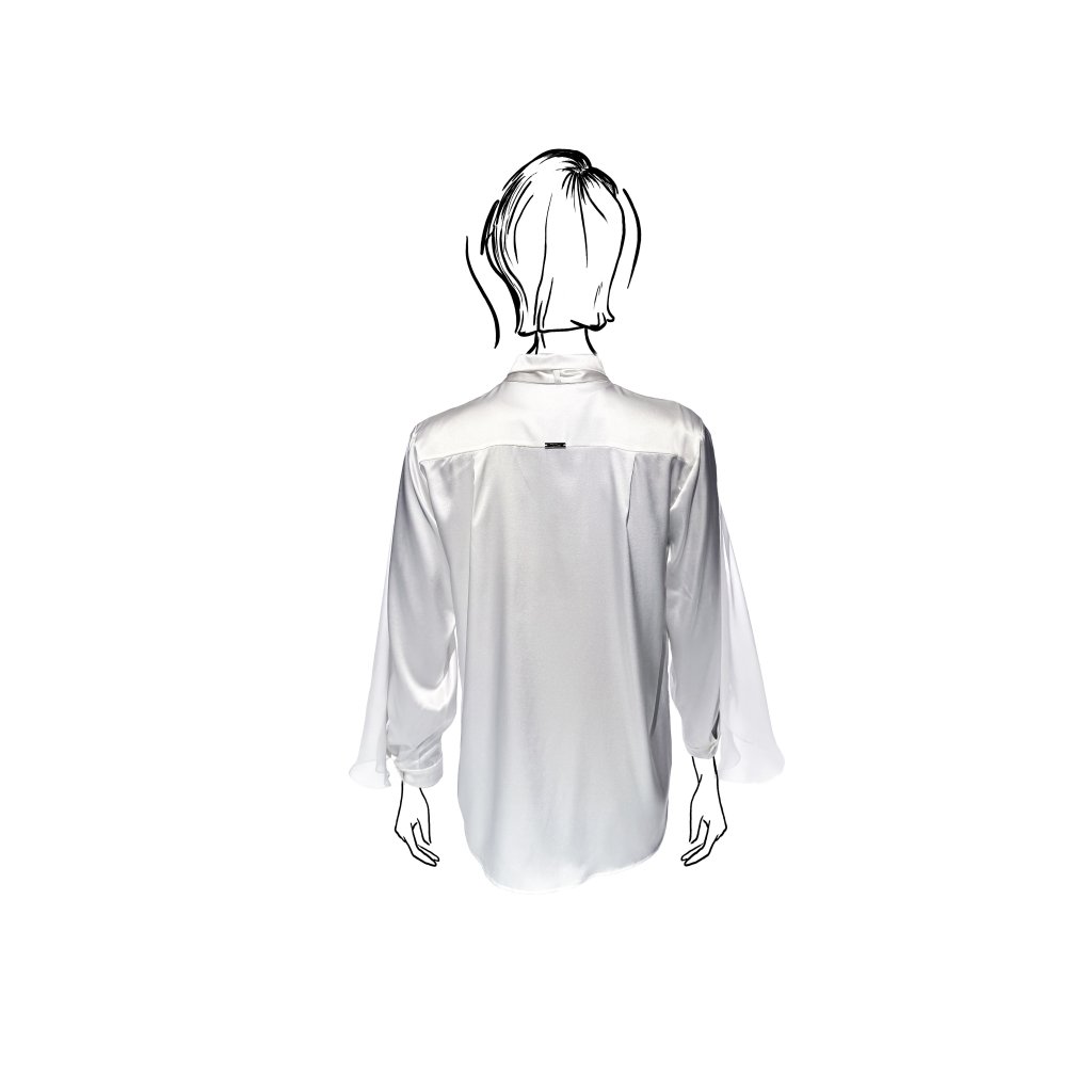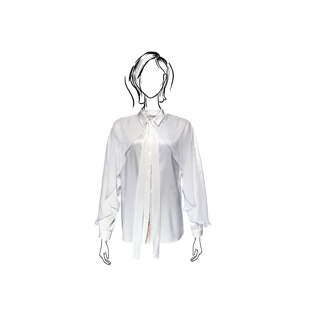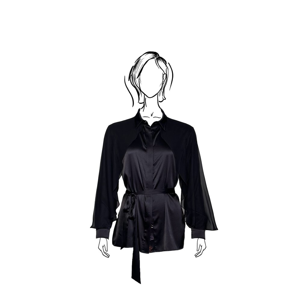 This shirt blouse made of fine satin silk is a timeless and striking piece. The smooth satin with its natural sheen responds to every movement, creating a softly flowing silhouette. The dominant feature is the sleeves adorned with lightweight chiffon veils, which add movement, lightness, and sophistication to the design.