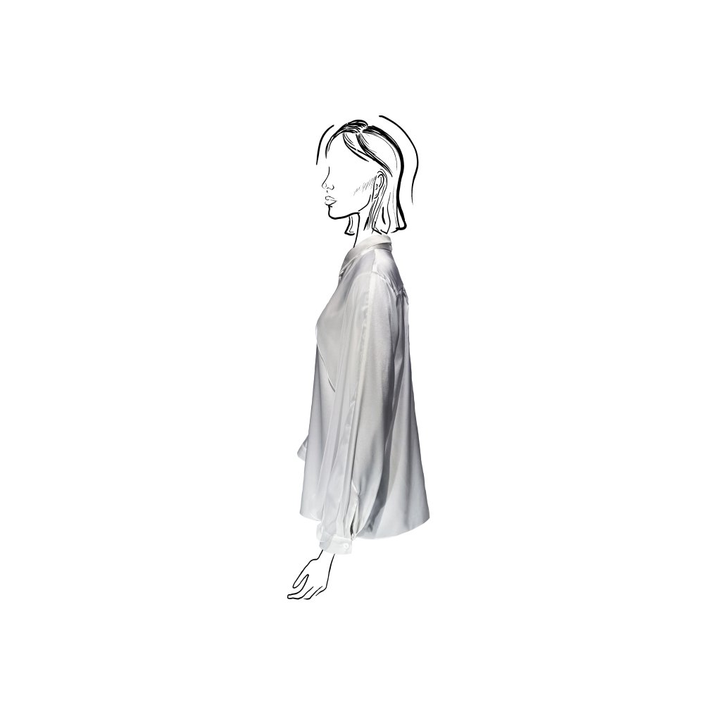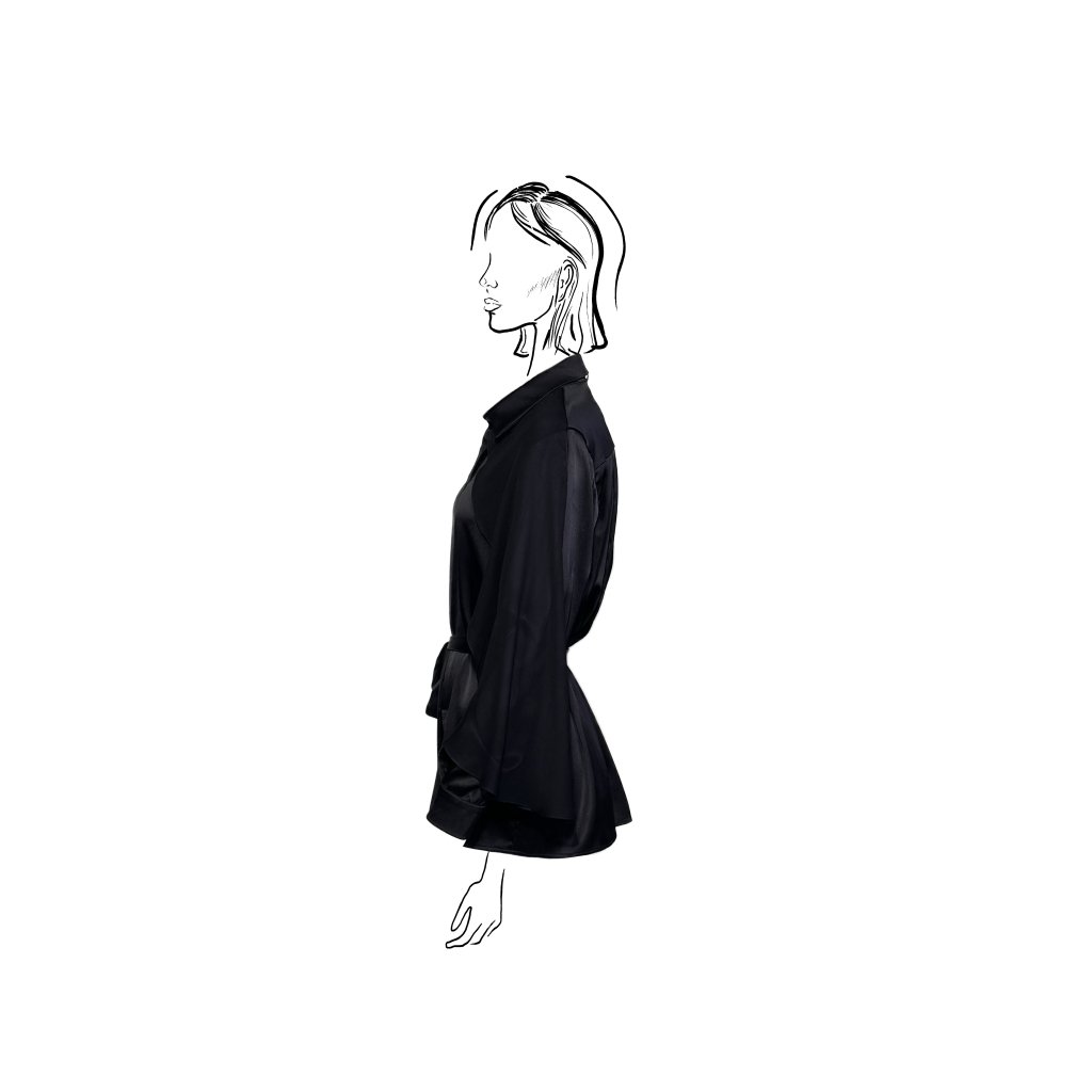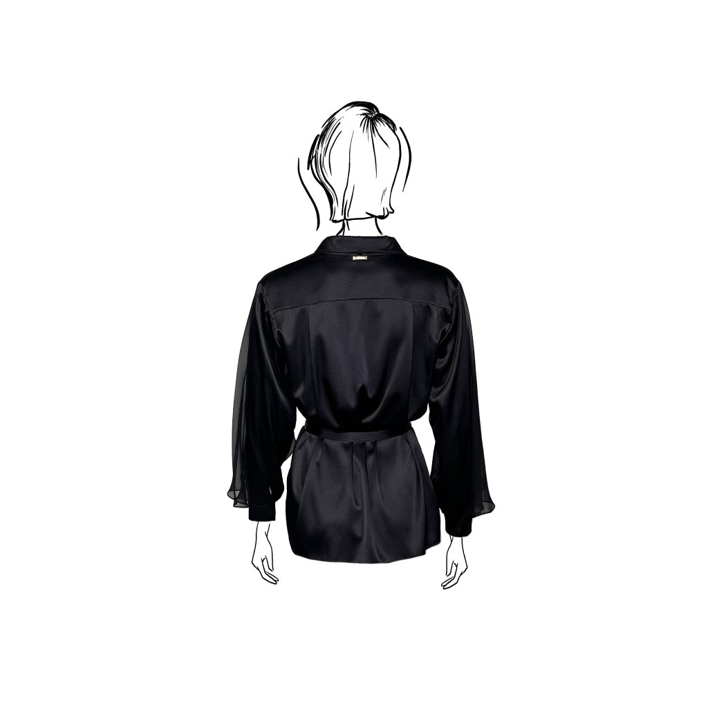 This shirt blouse made of fine satin silk is a timeless and striking piece. The smooth satin with its natural sheen responds to every movement, creating a softly flowing silhouette. The dominant feature is the sleeves adorned with lightweight chiffon veils, which add movement, lightness, and sophistication to the design.